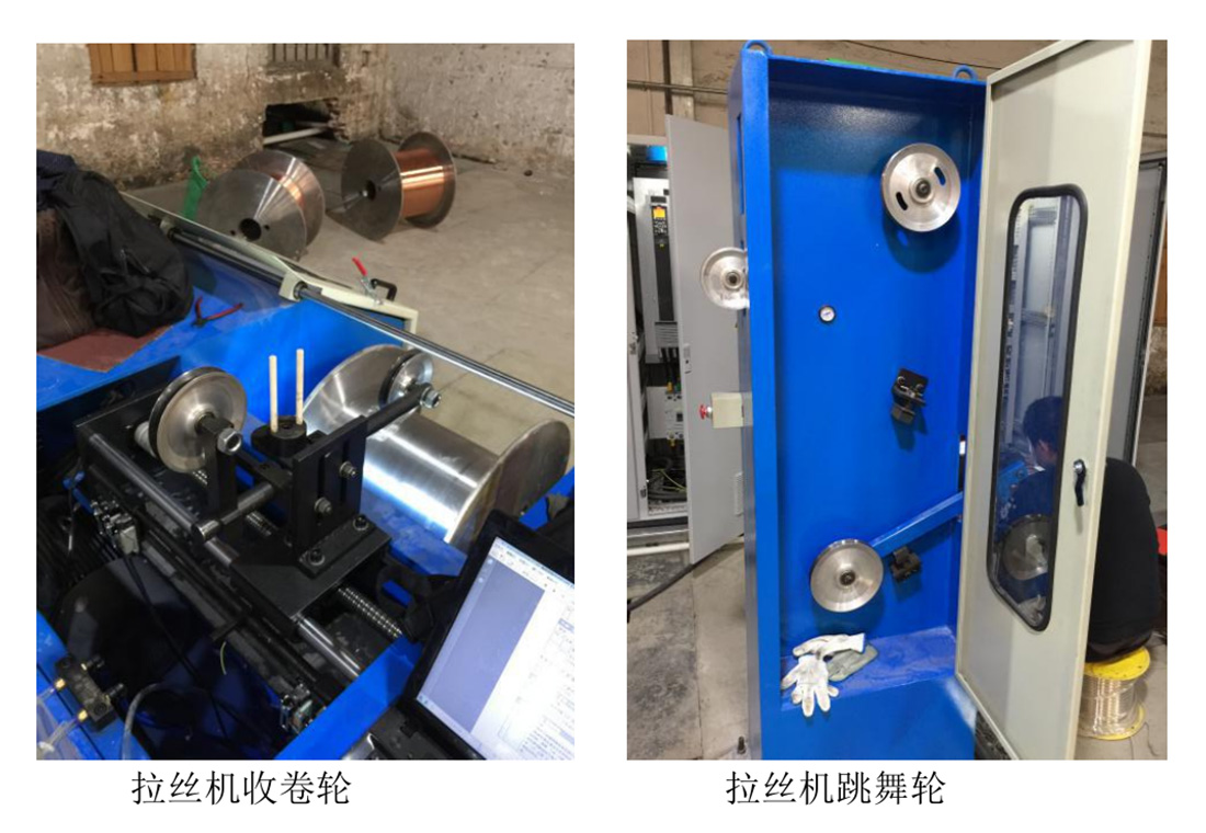 上面兩張圖片是我司技術(shù)工程師在廣東佛山某電纜廠拍的,因?yàn)楫?dāng)時(shí)我們主要是在現(xiàn)場調(diào)試后面的收卷部分,也是難點(diǎn)的一部分,所以就拍了收卷輪和跳舞輪的圖片。當(dāng)時(shí)現(xiàn)場的收卷電機(jī)是三相異步電動(dòng)機(jī),功率為15KW,采用18.5KW的FC360頻器進(jìn)行控制。變頻器外接設(shè)備上檢測跳舞輪位置的滑動(dòng)電阻,作為反饋跳舞輪位置的反饋信號(hào);外接通過PLC 前饋計(jì)算后的模擬量輸出作為前饋信號(hào)。