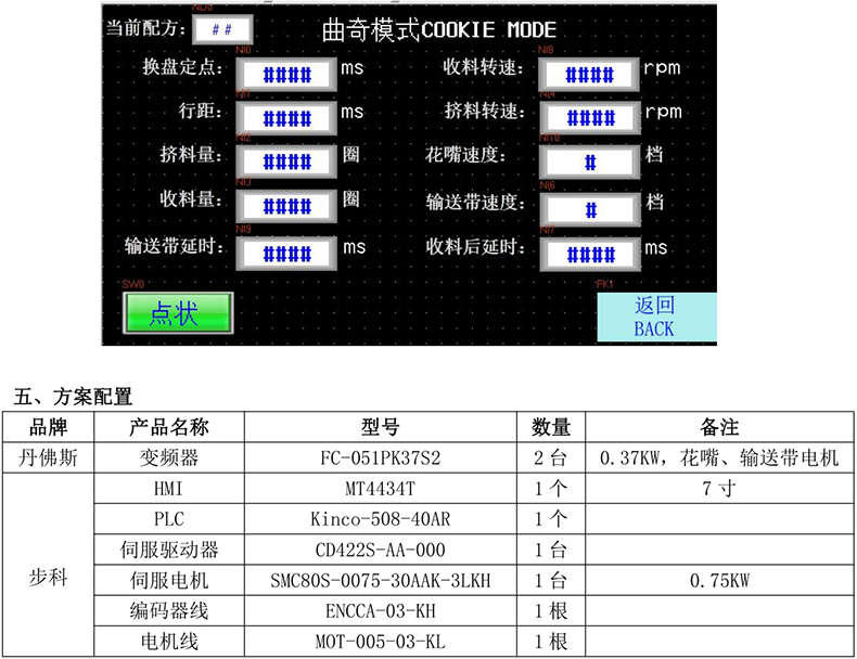 該設(shè)備只需在 HMI 上設(shè)定簡(jiǎn)單參數(shù),無需更換設(shè)備即可生產(chǎn)多種外形的曲奇餅干。步科提供的 PLC+HMI+伺服產(chǎn)品,無論從性能、穩(wěn)定性,還是服務(wù)方面,都給客戶留下了深刻的印象