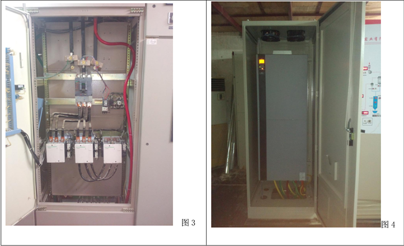 根據(jù)實(shí)際情況及以上的分析,電機(jī)采用丹佛斯 FC302 系列變頻器(額定功率 315KW,額定電流 600A)控制,變頻器前端加裝一個(gè)保護(hù)斷路器(額定電流 630A),因生產(chǎn)車(chē)間環(huán)境很惡劣,需為變頻器配備電柜(如上圖 4),放置于中央控制室。