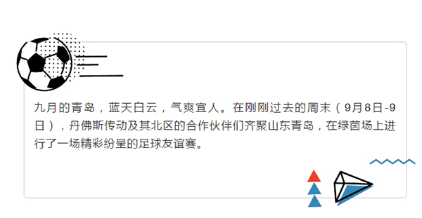 8日上午,在丹佛斯傳動中國區(qū)副總裁盧中平和北區(qū)合作伙伴代表北京聯(lián)澤總經理劉劍濤的致辭中,足球賽拉開了帷幕!本次足球賽本著“友誼第一”的原則,為大家提供了一個既可以感受足球魅力,又可以相互交流的平臺。并以此為契機,激發(fā)熱情,強健體魄,凝聚力量!