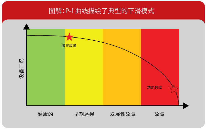 基于工況的維護(hù)是利用獲取的數(shù)據(jù)監(jiān)測(cè)現(xiàn)有設(shè)備的健康狀況。為此,要選擇關(guān)鍵參數(shù)作為識(shí)別發(fā)展性故障的指標(biāo)。設(shè)備狀況通常會(huì)隨著時(shí)間的推移而下滑。P-f 曲線表明了典型的下滑模式。設(shè)備不能執(zhí)行預(yù)期的功能時(shí),就會(huì)發(fā)生功能故障。基于工況的維護(hù)就是要在故障真正發(fā)生之前檢測(cè)潛在的故障。規(guī)劃維護(hù)措施的優(yōu)勢(shì)如下: