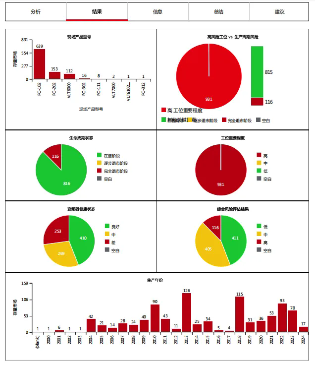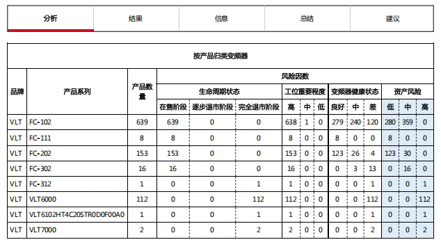 丹佛斯工程師帶領(lǐng)團(tuán)隊(duì),現(xiàn)場推進(jìn)評估工作。依據(jù)現(xiàn)場評估所獲取的數(shù)據(jù)信息可知,當(dāng)前該熱力公司在用的變頻器以丹佛斯FC102和FC202機(jī)型為主,有少量FC302和FC111機(jī)型,其中112臺(tái)已退市的VLT6000機(jī)型仍在使用,445臺(tái)變頻器已使用超過10年,253臺(tái)變頻器健康狀態(tài)較差。此次現(xiàn)場評估工作從變頻器健康狀態(tài)、生命周期、工位重要程度三個(gè)維度進(jìn)行了分析,幫助客戶梳理變頻器臺(tái)賬,排查故障,為后續(xù)的設(shè)備維保改造與預(yù)算制定計(jì)劃提供了依據(jù)。