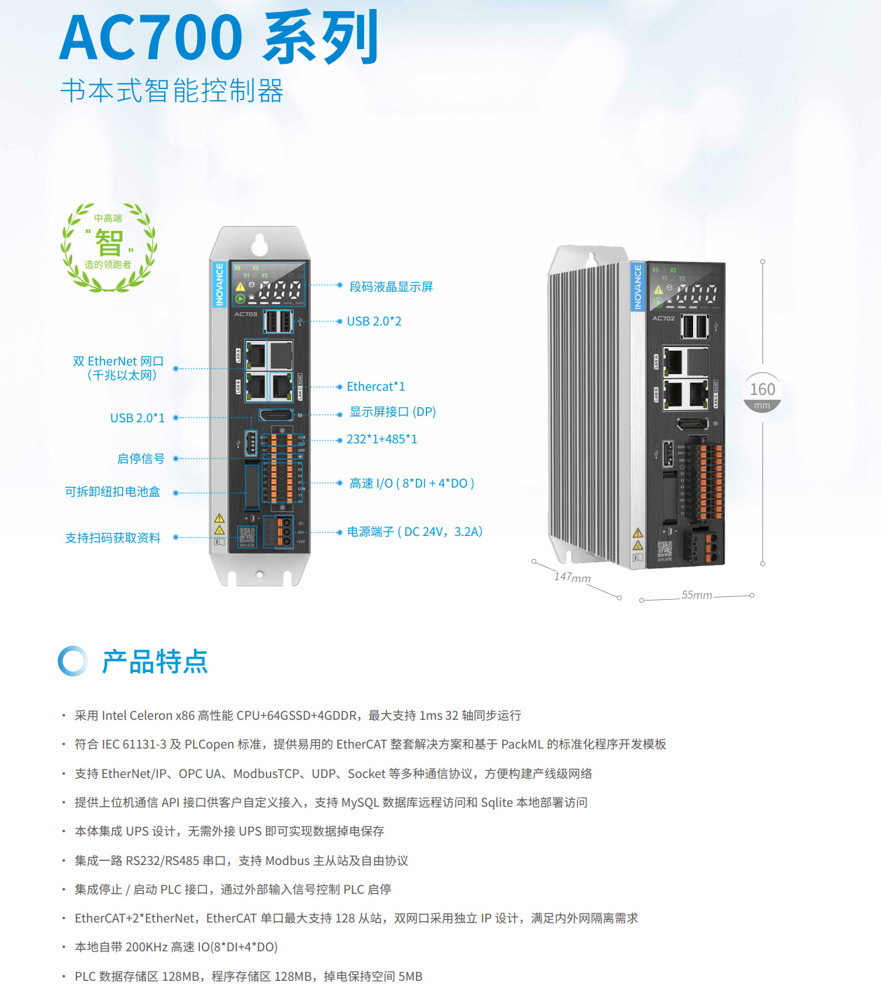 AC700系列書(shū)本式智能機(jī)械控制器,是基于Intel X86處理器硬件平臺(tái),符合PLCopen規(guī)范和IEC-61131-3標(biāo)準(zhǔn)的高性能運(yùn)動(dòng)控制器,支持ST,LD,SFC,CFC編程語(yǔ)言。標(biāo)配EtherCAT工業(yè)以太網(wǎng)實(shí)時(shí)總線,可以實(shí)現(xiàn)最大32軸同步控制。全系配置兩路千兆以太網(wǎng)口,支持EtherNet/IP與OPC UA等主流通訊協(xié)議,可以輕松的實(shí)現(xiàn)生產(chǎn)現(xiàn)場(chǎng)與IT系統(tǒng)的數(shù)據(jù)交互。同時(shí),AC700本體集成UPS(不間斷電源),即無(wú)需外接UPS即可實(shí)現(xiàn)數(shù)據(jù)掉電保存。匯川在工業(yè)自動(dòng)化領(lǐng)域超過(guò)7年的軟件平臺(tái)深度迭代開(kāi)發(fā)與工藝算法庫(kù)積累,使其可以簡(jiǎn)單、高效、穩(wěn)定的搭建設(shè)備應(yīng)用程序,尤其在高速、高精、高性能需求的大規(guī)模過(guò)程自動(dòng)化、產(chǎn)線自動(dòng)化和工廠自動(dòng)化智能制造領(lǐng)域十分適用。