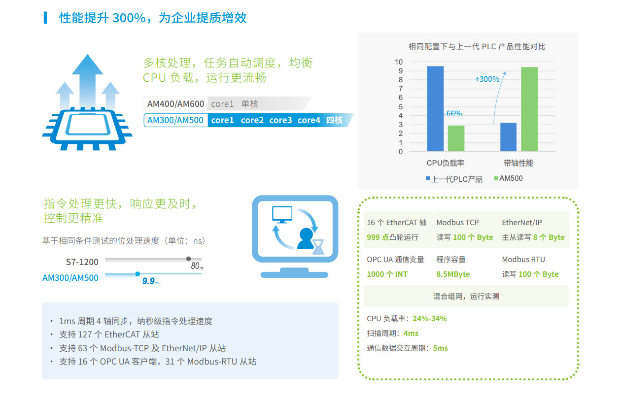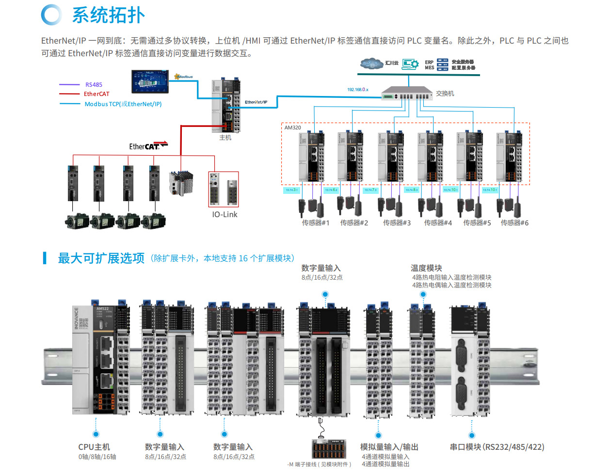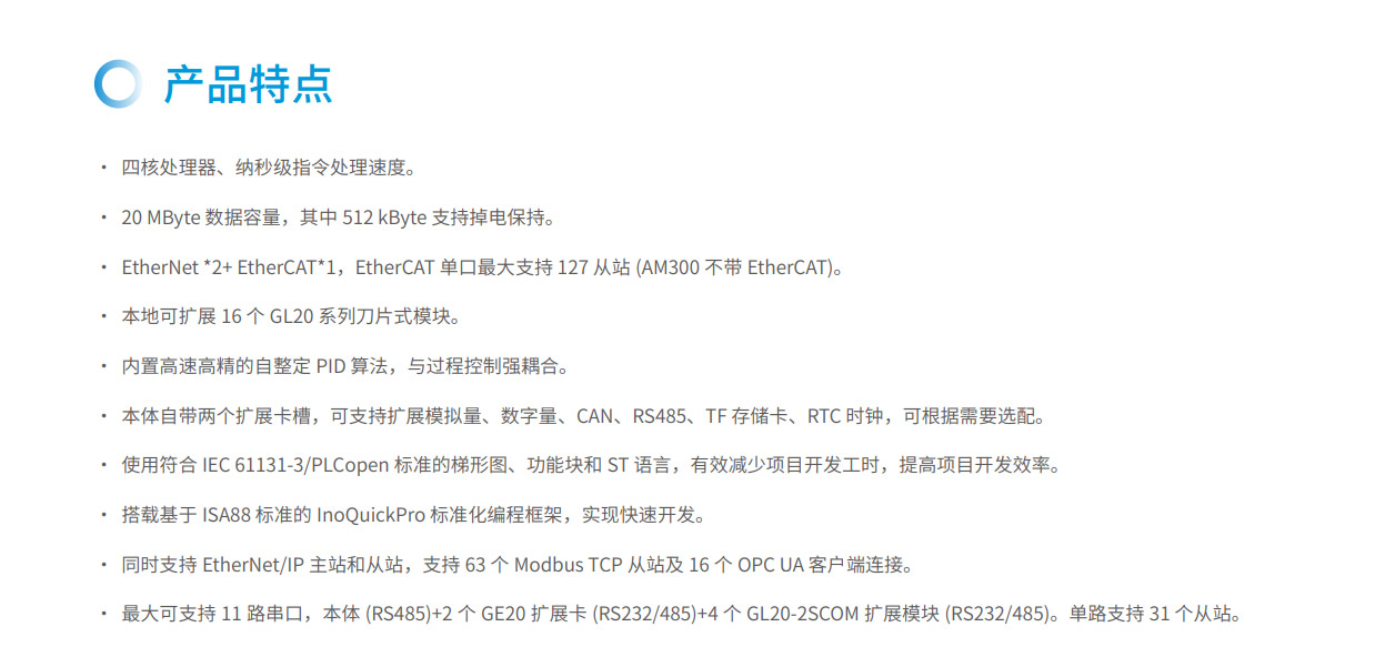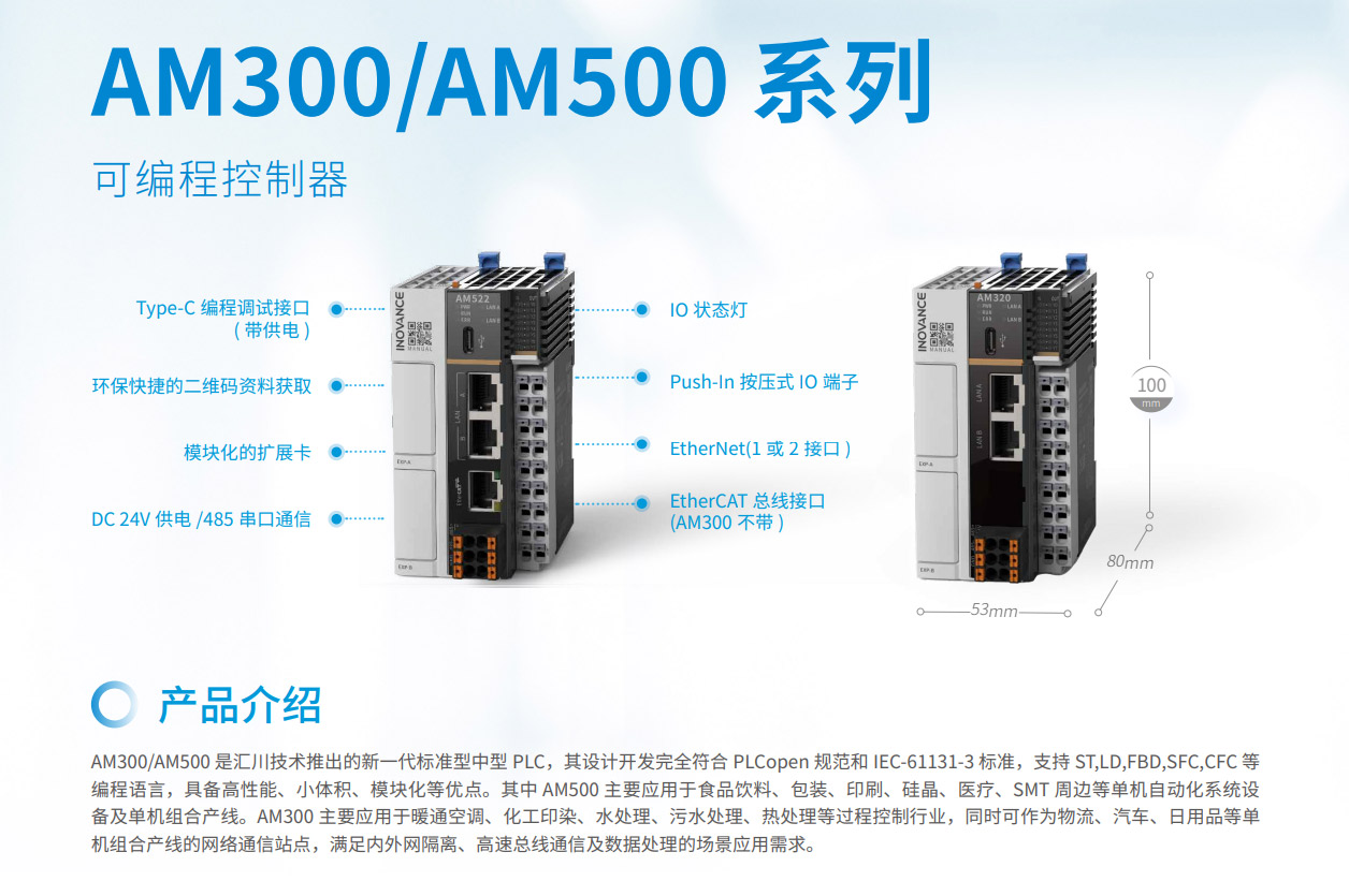 AM300系列是匯川技術(shù)推出的新一代中型PLC,其設(shè)計開發(fā)完全符合PLCopen規(guī)范和IEC-61131-3標準,支持ST,LD,SFC,CFC等編程語言,具備高性能、小體積、模塊化等優(yōu)點。集成如EtherNet/IP、OPC UA、Modbus TCP(支持兩路不同網(wǎng)段的IP地址)、TCP/IP、RS485(最大可擴展至3路)、CAN總線等全球標準工業(yè)網(wǎng)絡(luò)。主要應用于暖通空調(diào)、化工印染、水處理、污水處理、熱處理等過程控制行業(yè),同時可作為物流、汽車、日用品等單機組合產(chǎn)線的網(wǎng)絡(luò)通信站點,滿足內(nèi)外網(wǎng)隔離、高速總線通信及數(shù)據(jù)處理的場景應用需求。其開發(fā)編程平臺InoProShop覆蓋從多軸復雜應用、離散單機應用到基本邏輯應用,可搭載匯川技術(shù)基于ISA88標準開發(fā)的InoQuickPro標準化編程模板框架,實現(xiàn)規(guī)范的標準化管理開發(fā),降低人才培訓成本。