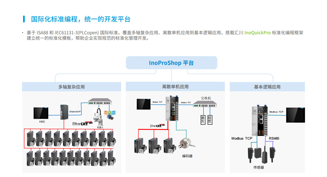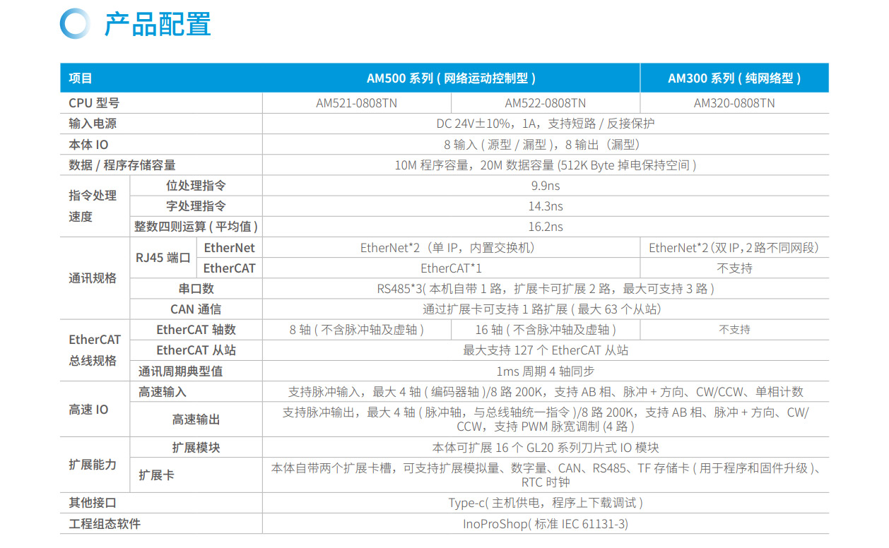 AM500系列是匯川技術(shù)推出的新一代標準型中型PLC,其設(shè)計開發(fā)完全符合PLCopen規(guī)范和IEC-61131-3標準,支持ST,LD,SFC,CFC等編程語言,以其小巧的CPU體積、模塊化靈活組合及高節(jié)拍生產(chǎn)特性可適應更多的應用場景。支持EtherCAT、EtherNet/IP、OPC UA、Modbus TCP(支持兩路同一網(wǎng)段的IP地址)、TCP/IP、RS485(最大可擴展至3路)、CAN總線等全球標準的工業(yè)網(wǎng)絡(luò)。主要應用于食品飲料、包裝、印刷、硅晶、醫(yī)療、SMT周邊等單機自動化設(shè)備及單機組合產(chǎn)線,滿足生產(chǎn)效率及控制精度提升場景需求。其開發(fā)編程平臺InoProShop覆蓋從多軸復雜應用、離散單機應用到基本邏輯應用,可搭載匯川技術(shù)基于ISA88標準開發(fā)的InoQuickPro標準化編程模板框架,實現(xiàn)規(guī)范的標準化管理開發(fā),降低人才培訓成本。