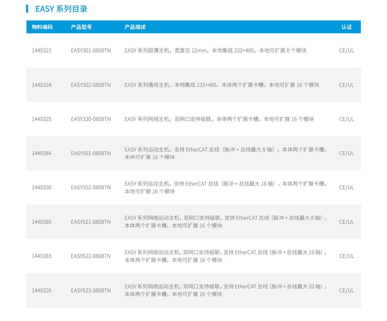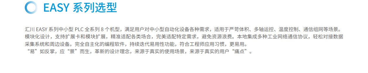 匯川EASY系列全場(chǎng)景緊湊型中小型控制器全系列8個(gè)機(jī)型,滿足用戶對(duì)中小型自動(dòng)化設(shè)備各種需求,適用于嚴(yán)苛體積、多軸運(yùn)控、溫度控制、通信組網(wǎng)等場(chǎng)景。機(jī)身模塊化設(shè)計(jì),支持?jǐn)U展卡和模塊擴(kuò)展,精準(zhǔn)適配各類場(chǎng)合,完美適配特定需求,避免資源浪費(fèi)。本地集成多種工業(yè)網(wǎng)絡(luò)通信協(xié)議,輕松對(duì)接數(shù)據(jù)采集系統(tǒng)和周邊設(shè)備。完全自主化的編程軟件,持續(xù)迭代易用性功能,符合工程師應(yīng)用習(xí)慣,更易用。 “易”如反掌,應(yīng)“景”而生,革新的設(shè)計(jì)理念,來(lái)源于真實(shí)的使用場(chǎng)景,來(lái)源于真實(shí)的用戶“痛點(diǎn)”。