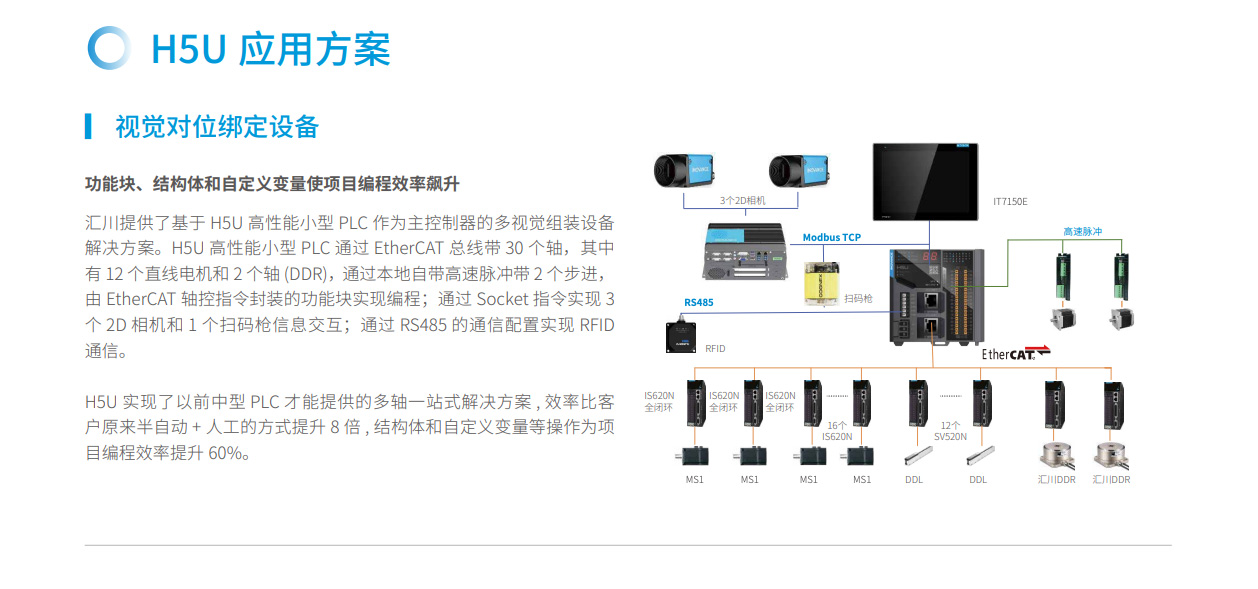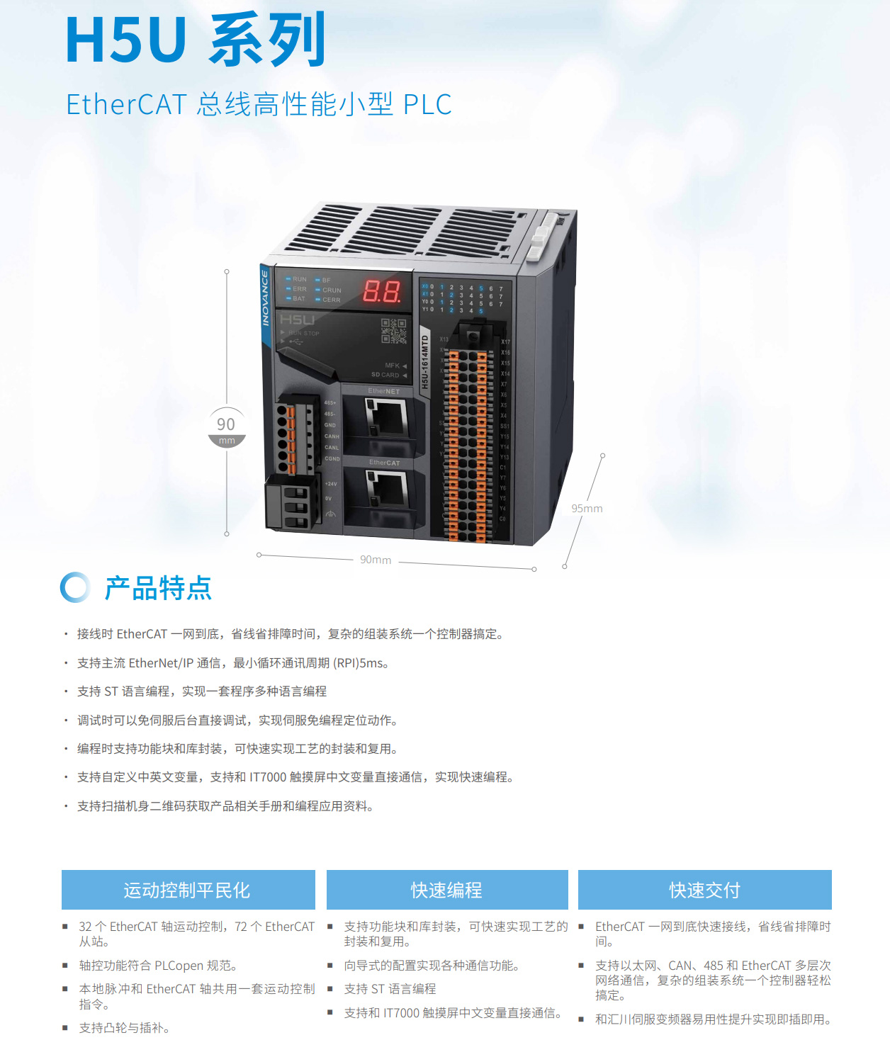 匯川技術(shù)推出首個應(yīng)用EtherCAT 總線的小型PLC H5U,讓線體設(shè)備飛速運(yùn)轉(zhuǎn)。隨著終端消費(fèi)日趨升級,生產(chǎn)制造面臨巨大的壓力,而H5U 能夠簡化布線量、加快編程調(diào)試時間、滿足帶軸能力的要求以及嚴(yán)苛的成本控制需求,從容應(yīng)對嚴(yán)峻的挑戰(zhàn),是將EtherCAT總線應(yīng)用到小型PLC 的先鋒之作。