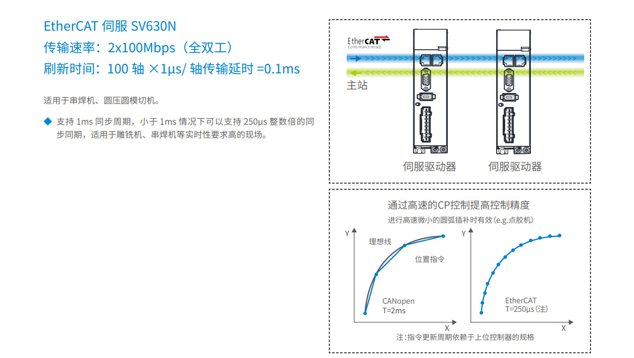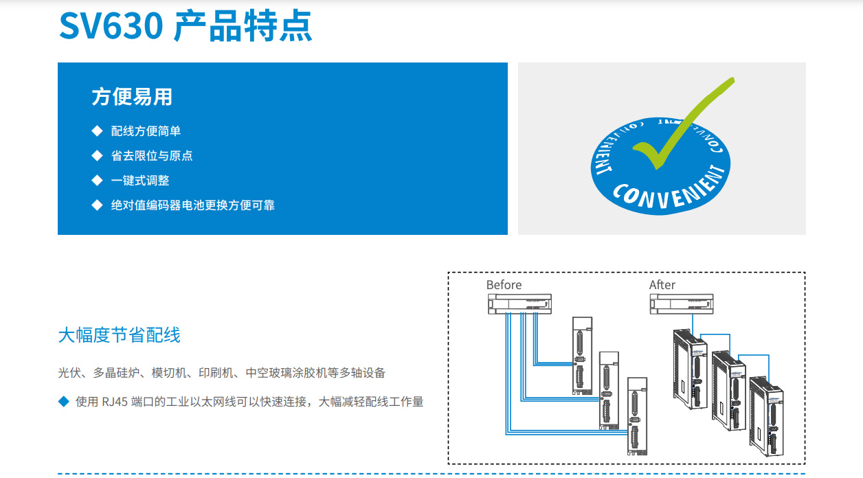 SV630 系列伺服是匯川技術(shù)研制的高性能中小功率的交流伺服產(chǎn)品。該系列產(chǎn)品功率范圍為0.05kW ~ 7.5 kW,采用以太網(wǎng)通訊接口,支持EtherCAT 、Modbus、CANopen 和CANLink 等通信協(xié)議,采用對應(yīng)的通信接口,配合上位機可實現(xiàn)多臺伺服驅(qū)動器聯(lián)網(wǎng)運行。