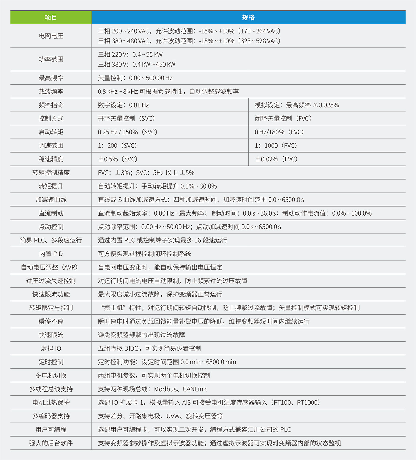 MD500E 系列變頻器是一款通用高性能電流矢量變頻器,主要用于控制和調(diào)節(jié)三相交流同步電機(jī)的速度和轉(zhuǎn)矩,是MD380E 系列的技術(shù)升級(jí)產(chǎn)品。MD500E 采用高性能的矢量控制技術(shù),低速高轉(zhuǎn)矩輸出,具有良好的動(dòng)態(tài)特性、超強(qiáng)的過(guò)載能力、增加了用戶可編程功能及后臺(tái)監(jiān)控軟件,通訊總線功能,支持多種PG 卡等,組合功能豐富強(qiáng)大,性能穩(wěn)定。